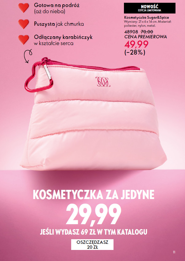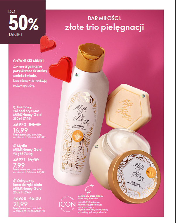 Ostatnia okładkowa strona katalogu Oriflame oferuje ulubione produkty pielęgnacyjne z kolekcji Milk&Honey. Krem pod prysznic, mydełko i krem do rąk i ciała tworzą złote trio dla każdej klientki Oriflame z rabatem do 50%. W walentynkowym stylu przez zapach do serca na uwagę zasługują drobiazgi ze strony 10. W limitowanej edycji mydełko i krem do rąk Treasured Moments będą doskonale podkreślały miłe klimaty. A kosmetyczka Sugar&Spice w ofercie specjalnej, puszysta jak chmurka będzie towarzyszką miłych podróży.