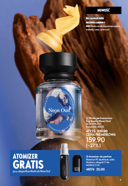 Okładkowa strona najnowszego katalogu Oriflame zapowiada luksusowe zapachy niszowe. Wiele kobiet poszukuje oryginalnych i niepowtarzalnych kompozycji zapachowych. Potrzeba wyróżnienia się i bycia zapamiętanym w obfitości komplementów i zachwytów sprawia poprawę nastroju. Oriflame podjęło współpracę ze Szkołą Perfumiarstwa Givaudan. I tak w najnowszym katalogu Oriflame pojawiły pierwsze dwa flakony z kolekcji Top Scents. Osmantus, dzika róża i piżmo tworzą Rose Mode. Ukryta za ciemną fasadą róża zaskakuje nowym obliczem. Drzewno-ambrowy Neon Oud podbija międzynarodową scenę swoją niepowtarzalną wyrazistością, po prostu nie sposób przejść obok niego obojętnie. Żywiczny akord oud wzmocni Twoją aurę. Przy zakupie wybranego flakonu Top Scents atomizer otrzymasz gratis.