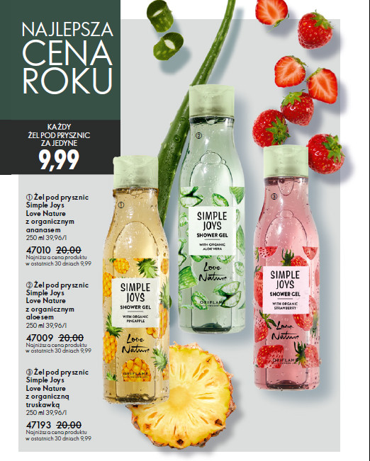 Ostatnia okładkowa strona katalogu Oriflame przenosi w owocowe kąpiele. W najlepszych cenach tego roku truskawka, ananas i aloes zamknięte w żelach pod prysznic sprawią przyjemność w codziennym dbaniu o siebie. Dobre ceny skłaniają do małych zapasów, a może drobnego upominku dla bliskiej osoby…