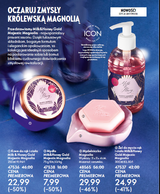 Ostatnia okładkowa strona katalogu Oriflame odsłania najwspanialszy prezent sezonu. Ulubiona przez konsultantki Oriflame kolekcja Milk&Honey została wzbogacona kwiatem magnolii. Trzy eleganckie produkty będą zdobiły teraz półki łazienkowe, ale przede wszystkim zadbają o codzienną pielęgnację. Do kosmetycznych drobiazgów, którym trudno będzie się oprzeć należy zdecydowanie śliwkowy Tender Care. Czy wiecie, że średnio co 15 sekund na świecie sprzedawany jest właśnie ten regenerujący balsam, a występuje w wielu odsłonach. Ekskluzywna pielęgnacja od dawna przypisywana jest kolekcji Essence&Co. Żel i balsam do ciała nasycone naturalnymi olejkami eterycznymi kwiatu lotosu i drzewa cedrowego zapewniają 48-godzinne nawilżenie. Bieżący katalog Oriflame na stronie 15 oddaje zestaw w promocyjnej cenie 54,99 zł.