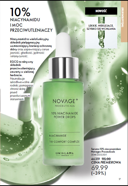 Każdy dzień to nowa okazja, by wyrazić siebie – a dobrym sposobem będzie nasza pielęgnacja premium. W tym katalogu Oriflame polecamy naszą nowość – serum z 10% niacynamidem. Ten wielofunkcyjny składnik pielęgnacyjny wzmacnia barierę ochronną skóry oraz zapewnia cerze jasność, jędrność i elastyczność. Zawarty aktywny składnik przeciwutleniający EGCG neutralizuje szkodliwe rodniki, pomagając chronić skórę przed wczesnym starzeniem się. Dzięki serum cera będzie wyglądała promiennie i zdrowo. Premierowa cena produktu wynosi 69,99 zł.