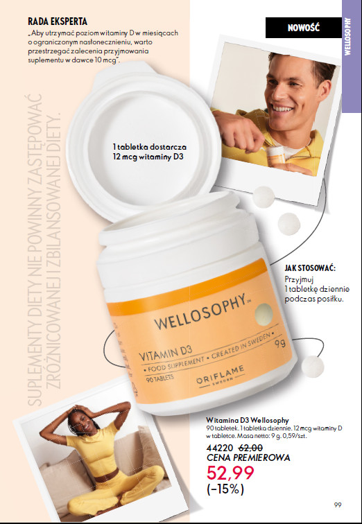 Pozostając w klimatach pielęgnacji twarzy warto pamiętać o produktach oczyszczających z kolekcji NovAge+. Na str. 79 polecamy w promocji olejek, żel i soniczną szczoteczkę oczyszczającą. Czysta skóra będzie lepiej wchłaniała wszelkie składniki nawilżające i odżywcze zawarte w serum, kremach, czy maseczce na noc, która jest w świetnej cenie za 47,99 zł. Spokojny i zdrowy sen będzie wspomagany Magnezem pochodzenia morskiego z witaminą B6. Wspominając o suplementach warto zwrócić uwagę wszystkich klientek Oriflame, że mamy teraz witaminę D3. Jesienno-zimowy czas zderza nas z niedostatkiem słońca, które właśnie można znaleźć w kapsułkach witaminy D3. Wspomaga ona prawidłowe funkcjonowanie układu odpornościowego, mięśni oraz dba o zdrowe kości. Opakowanie zawiera aż 90 tabletek i wystarcza na trzy miesiące.