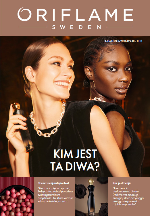 Okładkowa strona najnowszego katalogu Oriflame zapowiada premierę nowej wody perfumowanej Divine Dark Velvet. Odważna i jednocześnie kobieca kompozycja ma w sobie elegancję, pewność siebie i odrobinę tajemniczości. Akord ciemnej śliwki wzmocni hipnotyzującą stronę osobowości każdej klientki Oriflame, a aksamitna róża Baccara, ubrana w intensywną paczulę pozwoli lśnić Twojej godnej diwy energii. Premierze nowego flakonu towarzyszy naszyjnik Divine Dark Velvet. Specjalne okazje wymagają wyjątkowego dodatku.