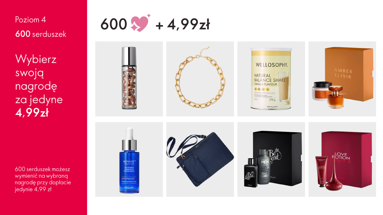 Jako Klubowiczka Oriflame masz 15% rabatu na start i 15% cashbacku w kolejnym zamówieniu. Zyskaj więcej w Oriflame. Poznaj Program Beauty Hearts przygotowany dla wszystkich klubowiczów Oriflame i Partnerów Biznesowych Oriflame. Wystartuj z darmową wysyłką zamówienia za min. 200 zł na dowolny paczkomat. W kolejnym zamówieniu odbierz swoją nagrodę za 200 serduszek. Wybrany kosmetyk o wartości katalogowej do 80 zł możesz mieć za jedyne 4,99 zł. Powtórz swoją aktywność w kolejnych katalogach, zbieraj więcej serduszek i odbieraj nagrody z wyższych poziomów.