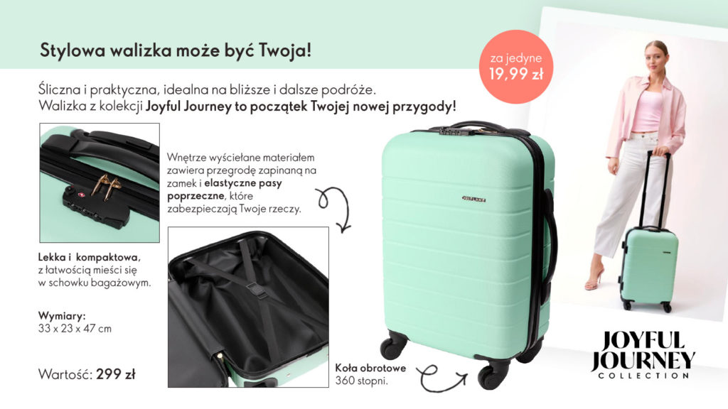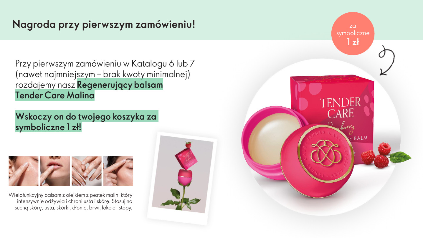 Jako Klubowiczka Oriflame masz 15% zysku natychmiastowego, do pierwszego zamówienia otrzymujesz w prezencie za 1 zł nasz kultowy produkt. Będzie to balsam do ust Tender Care w edycji malinowej. Zyskaj więcej w Oriflame i odbierz nagrodę główną. W każdym z trzech pierwszych katalogów swojej przygody w Oriflame złóż zamówienie za min. 200 zł. Takie zamówienie daje Ci również gwarancję darmowej dostawy na paczkomat lub wybrany punkt. W czwartym katalogu swojej aktywności odbierz walizkę Joyful Journej o wartości 299 zł. Za walizkę zapłacisz symboliczną kwotę 19,99 zł.